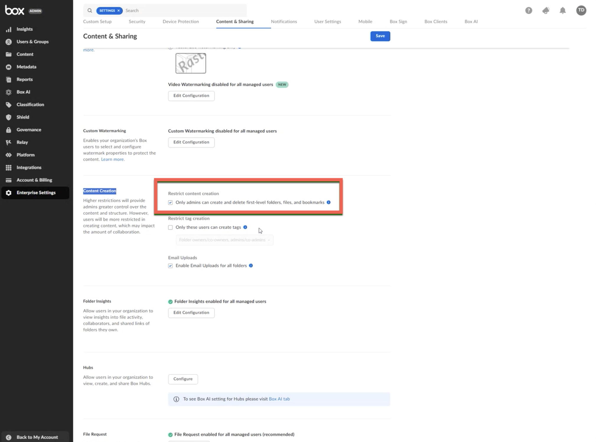 Um dies zu beheben, sollte ein Administrator in Box zu „Admin-Konsole“ → „Unternehmenseinstellungen“ → „Inhalt und Freigabe“ gehen und sicherstellen, dass der Benutzer zumindest während der Einrichtung Ordner der ersten Ebene erstellen darf.