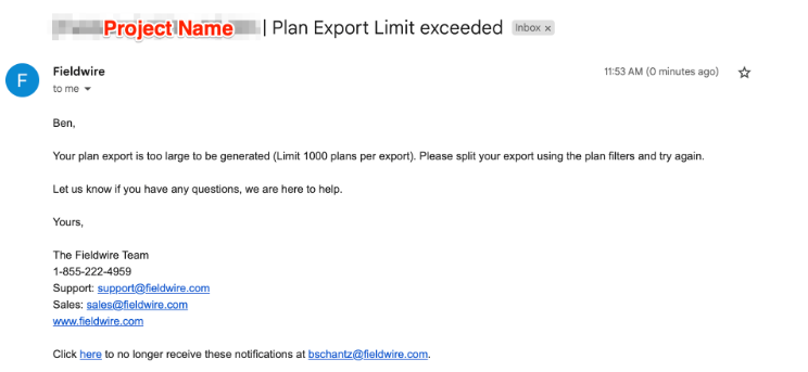 Hinweis: Es gibt ein Exportlimit von 1000 Plänen auf einmal. Wenn Sie versuchen, mehr als 1000 Pläne zu exportieren, erhalten Sie eine E-Mail-Benachrichtigung, die Sie darauf hinweist, dass der Export zu viele Pläne enthält und Sie den Export aufteilen sollen.
