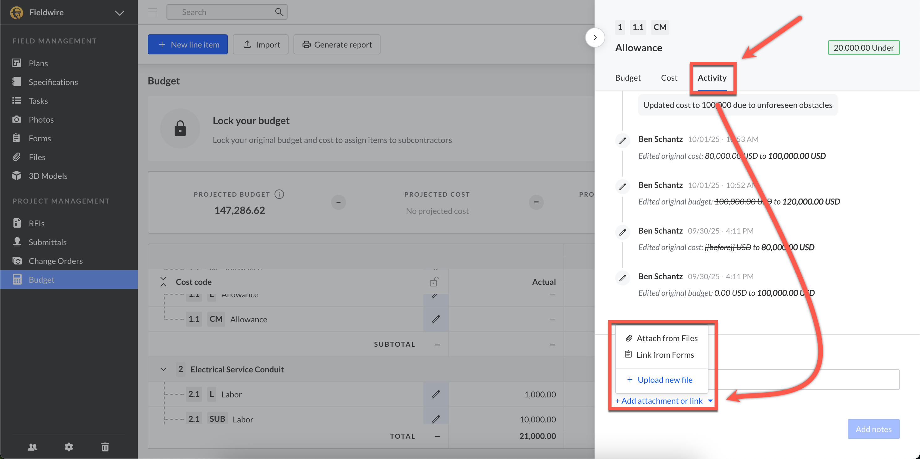 On the Activity feed of individual line items, you can also link existing files and forms! This creates a simple way to manage documentation, right from the Budget activity tab. To add a file and/or form:
