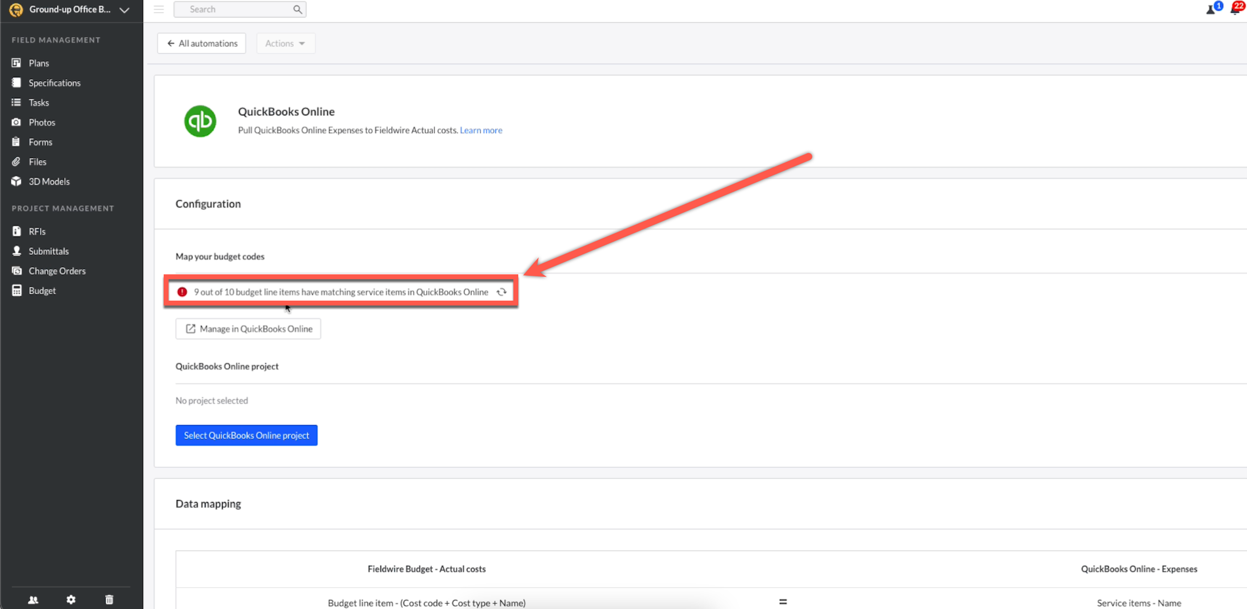 Automations control how data flows between QuickBooks Online and Fieldwire.