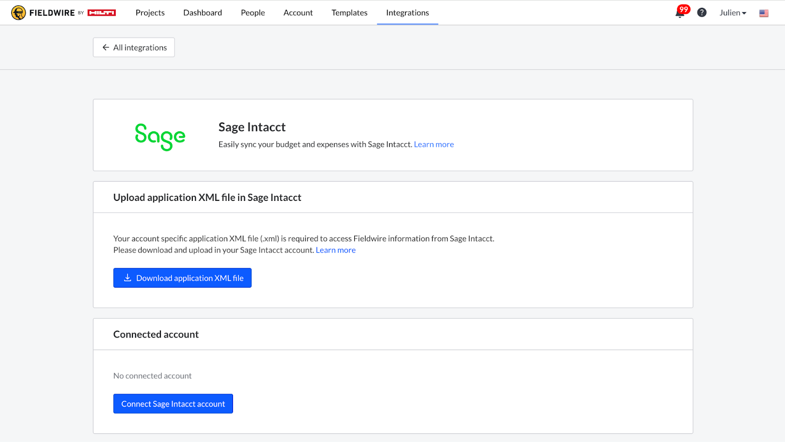 - Return to Fieldwire and click Connect Sage Intacct account.