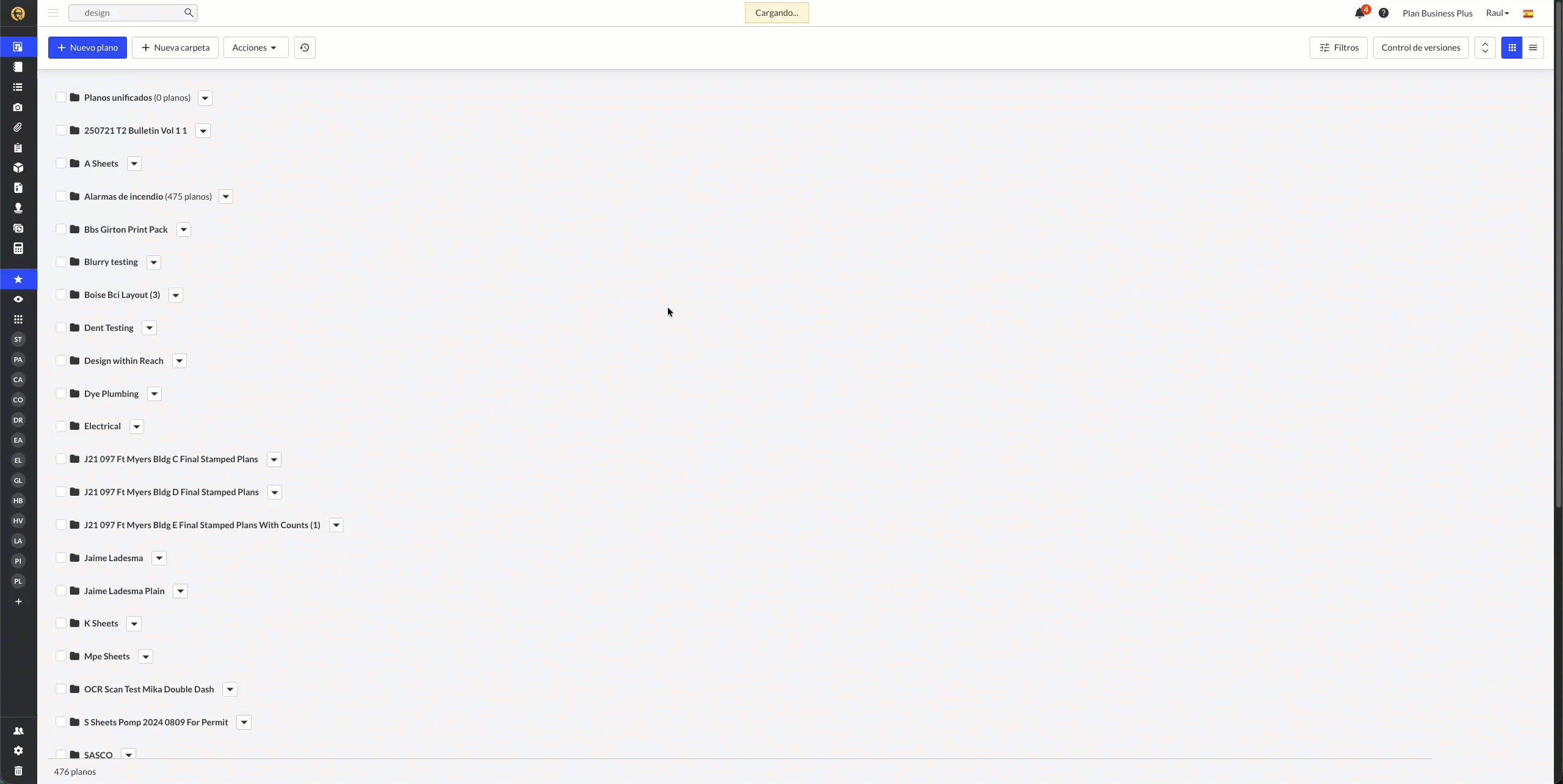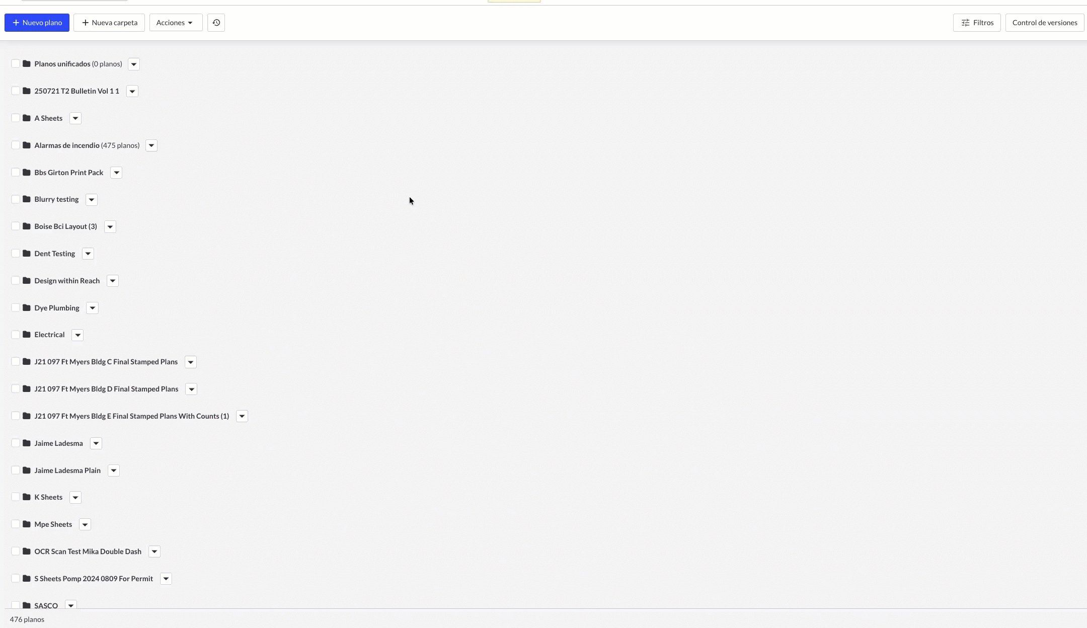 Esto muestra el historial de todos los planos que se han subido al proyecto. Estos incluyen los últimos 90 días de cargas de planos.