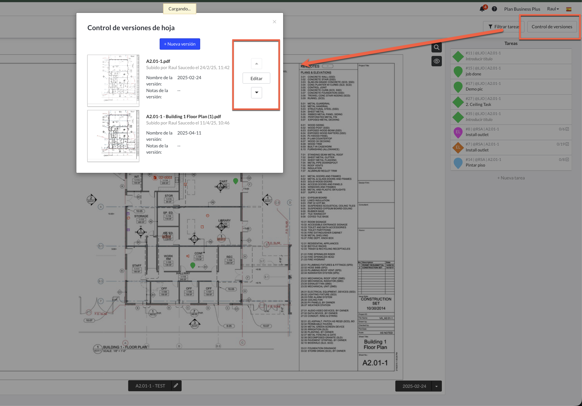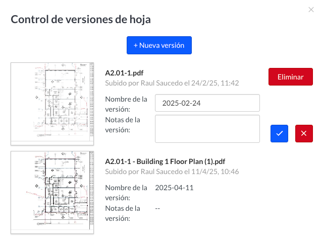 Coloca el cursor sobre una versión específica y verás que aparecen botones de flechas que te permiten cambiar el orden en que se muestra la versión. Esto es útil si subiste las hojas en una secuencia incorrecta, si los planos tienen una versión incorrecta, o si necesitas consultar el nombre del archivo de la hoja.