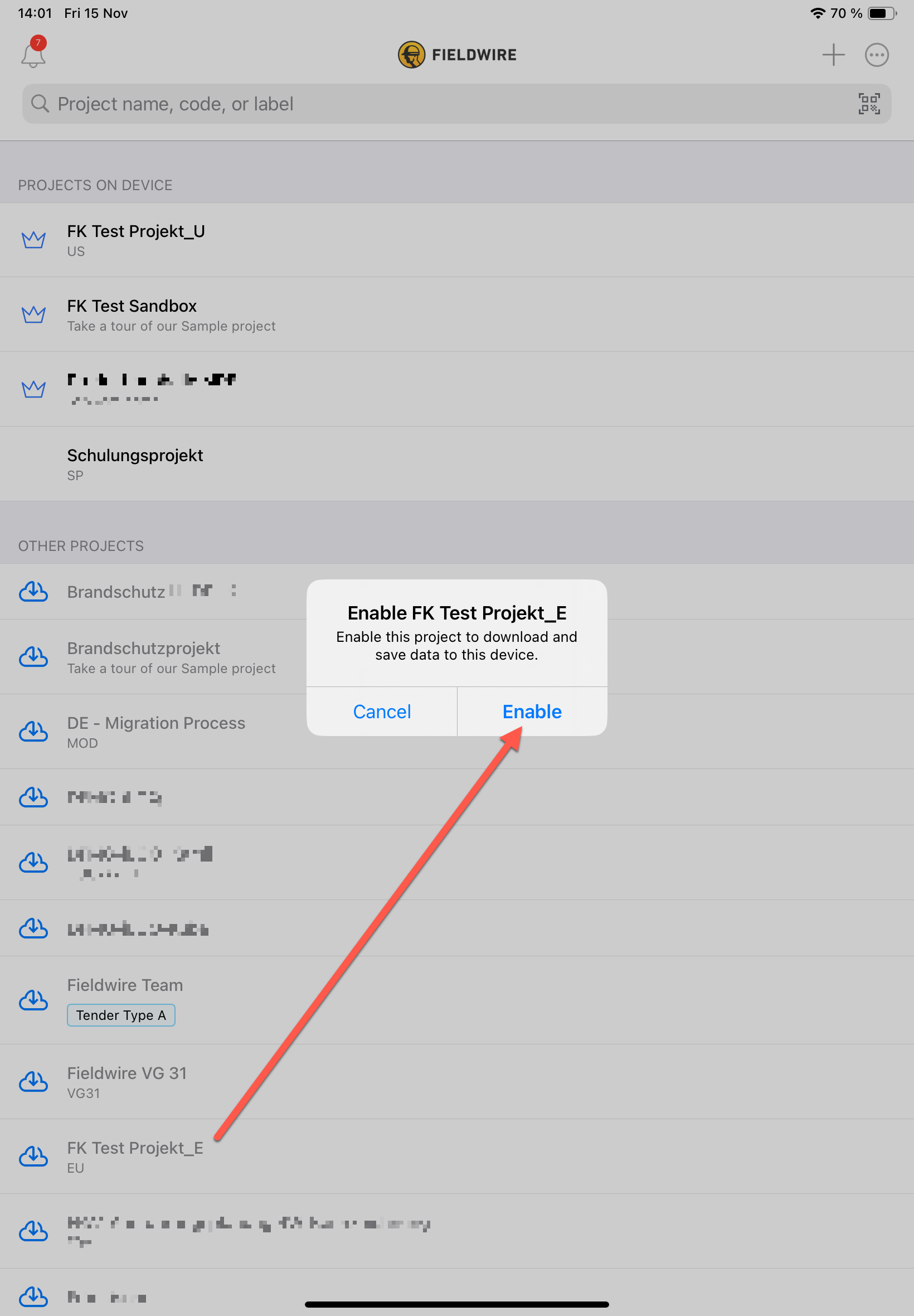 Cuando inicie sesión por primera vez en Fieldwire en su teléfono o tableta y vea su lista de proyectos activos, verá un ícono de nube al lado izquierdo de cada proyecto al que está invitado. Si hace clic en el título de un proyecto para abrirlo, se le pedirá que confirme si desea "habilitar" o sincronizar los datos de ese proyecto en su dispositivo.