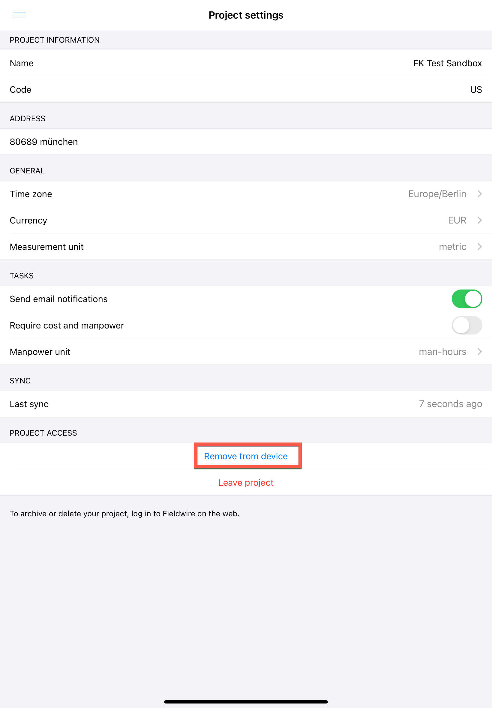 Nota: Cuando un proyecto se elimina del dispositivo, Fieldwire asegura que no se descargue nuevo contenido para ese proyecto en particular, lo que significa que el contenido ya descargado sigue existiendo en la memoria del teléfono.