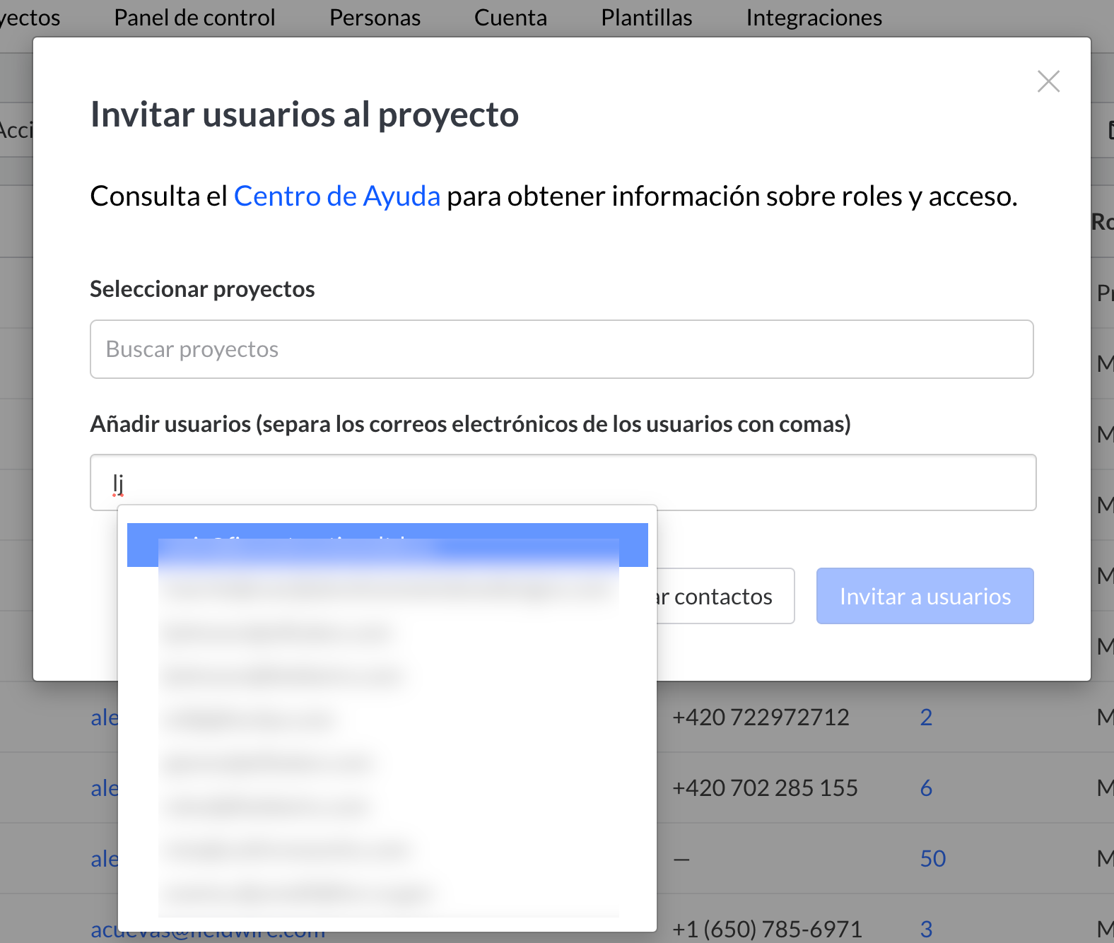 Cuando invitas usuarios a proyectos o a la cuenta bajo la pestaña 'Personas', las sugerencias de correo electrónico se llenan en base a los usuarios que ya han sido invitados a tus proyectos.