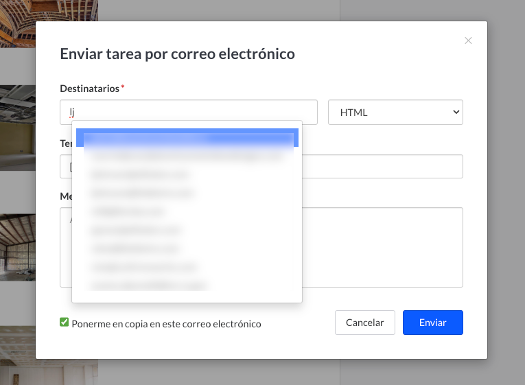 Los teléfonos y tabletas Android actualmente no ofrecen la opción de elegir entre los contactos guardados en la aplicación 'Mail' o en el dispositivo móvil. Necesitarás conocer la dirección de correo electrónico completa a la que deseas enviar la tarea, formulario o informe: