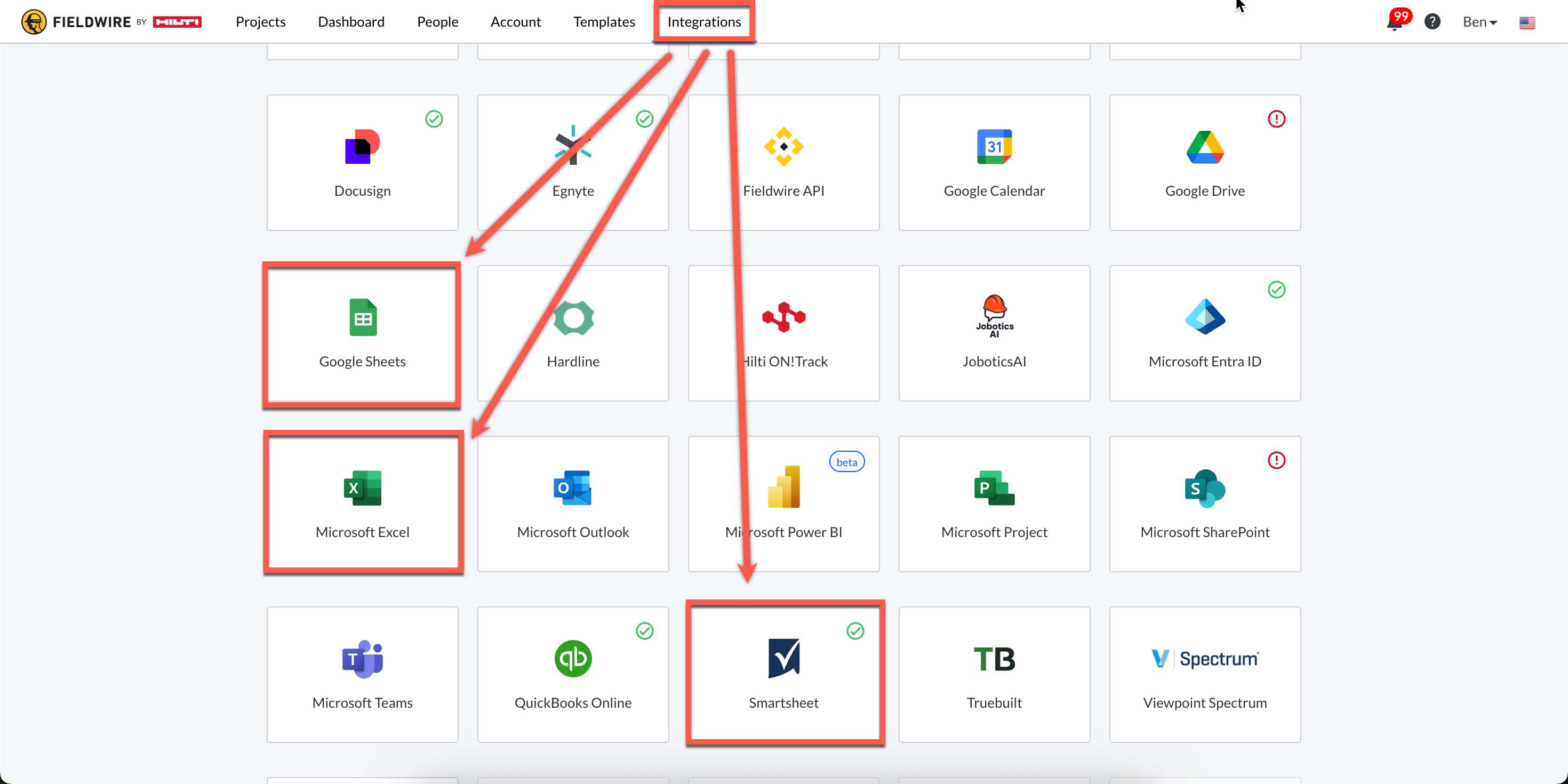 - Cuando los usuarios integran Fieldwire con Google Sheets o Microsoft Excel, pueden importar y rastrear automáticamente tareas en un panel centralizado de múltiples proyectos.