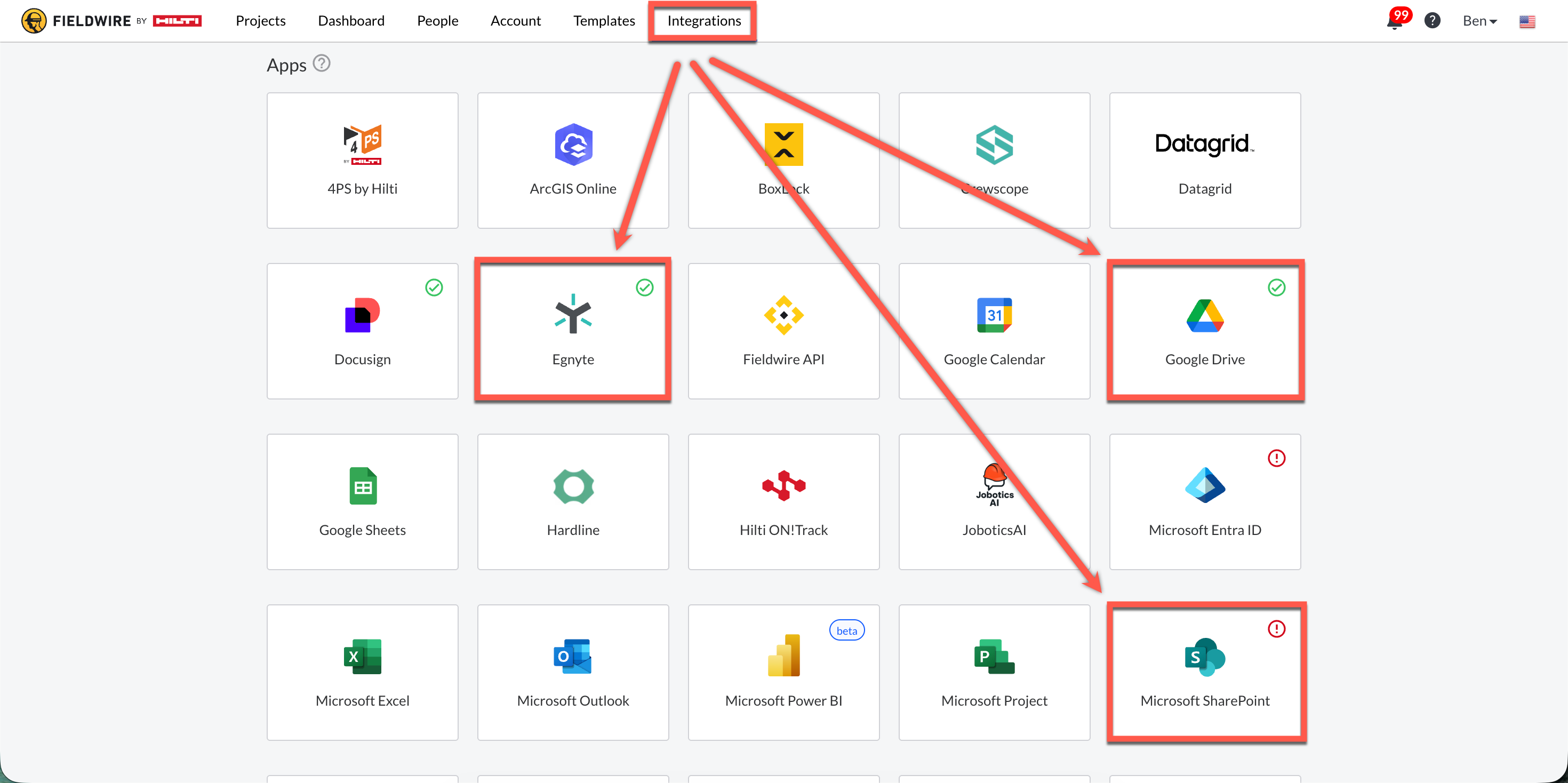 - Los usuarios pueden conectar sus cuentas y sincronizar documentos a los Archivos (Google Drive, SharePoint y Egnyte) y Planos (Google Drive y SharePoint) del proyecto en Fieldwire.