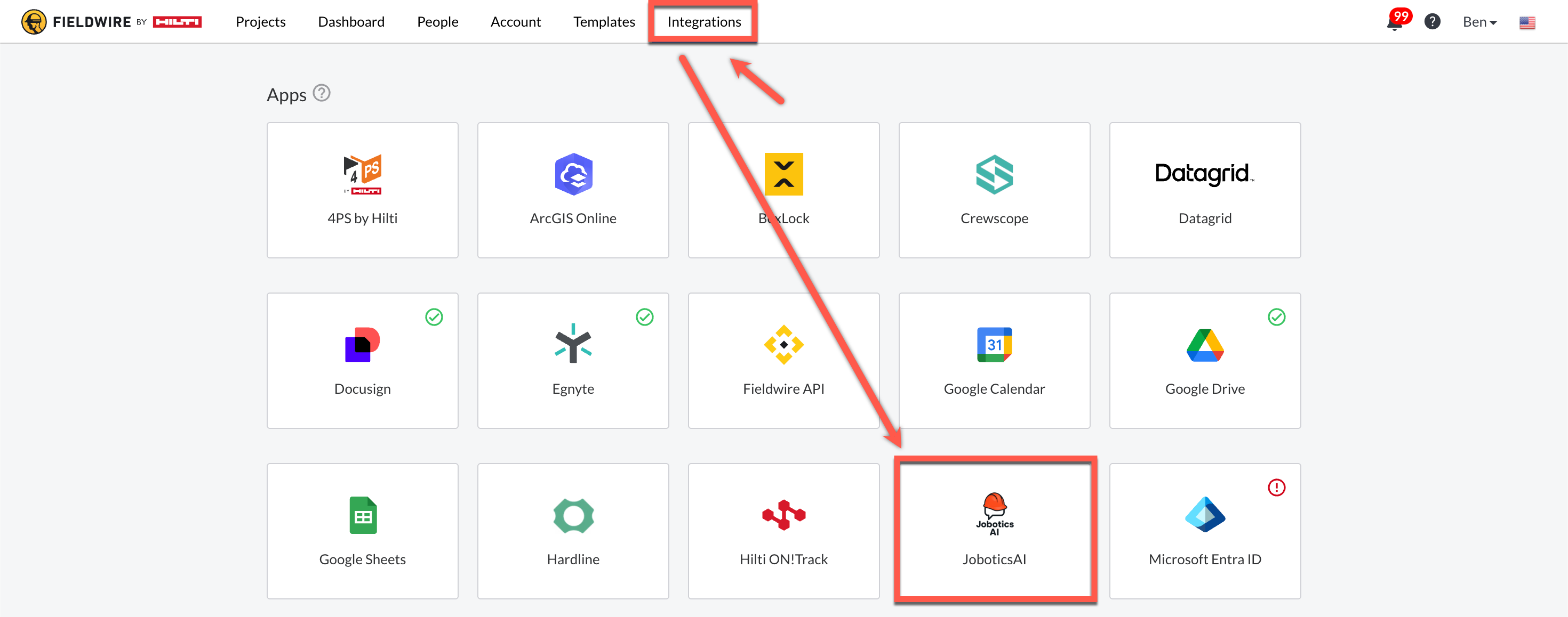 - La integración Jobotics permite a Jobotics analizar documentos seleccionados del proyecto almacenados en Fieldwire, como contratos, RFIs, submittals, actas de reuniones y registros de seguridad, y publicar un Informe Consolidado de Riesgos Jobotics en cada proyecto de Fieldwire.