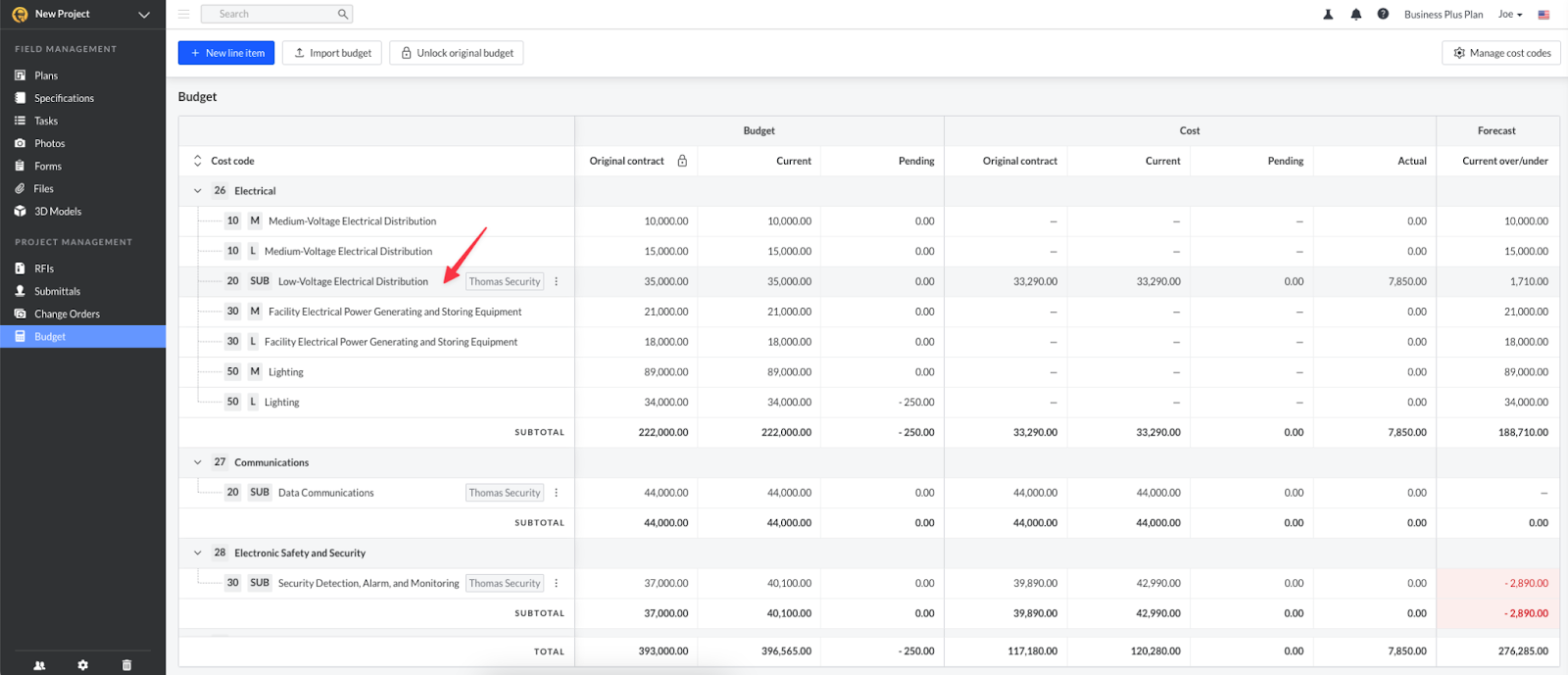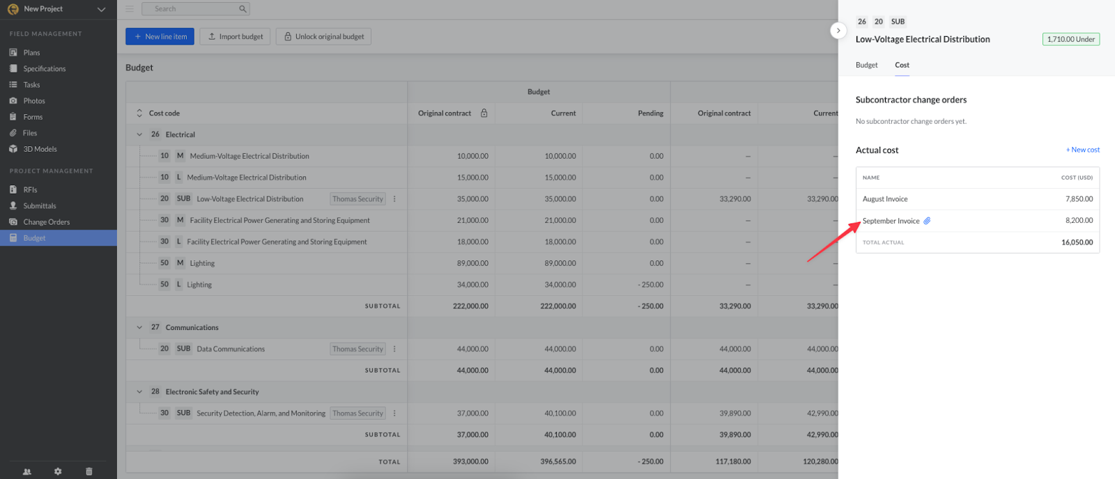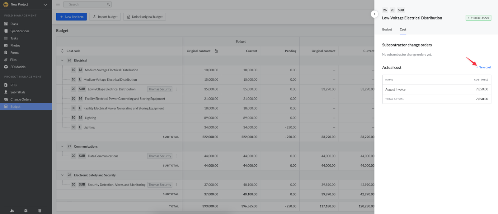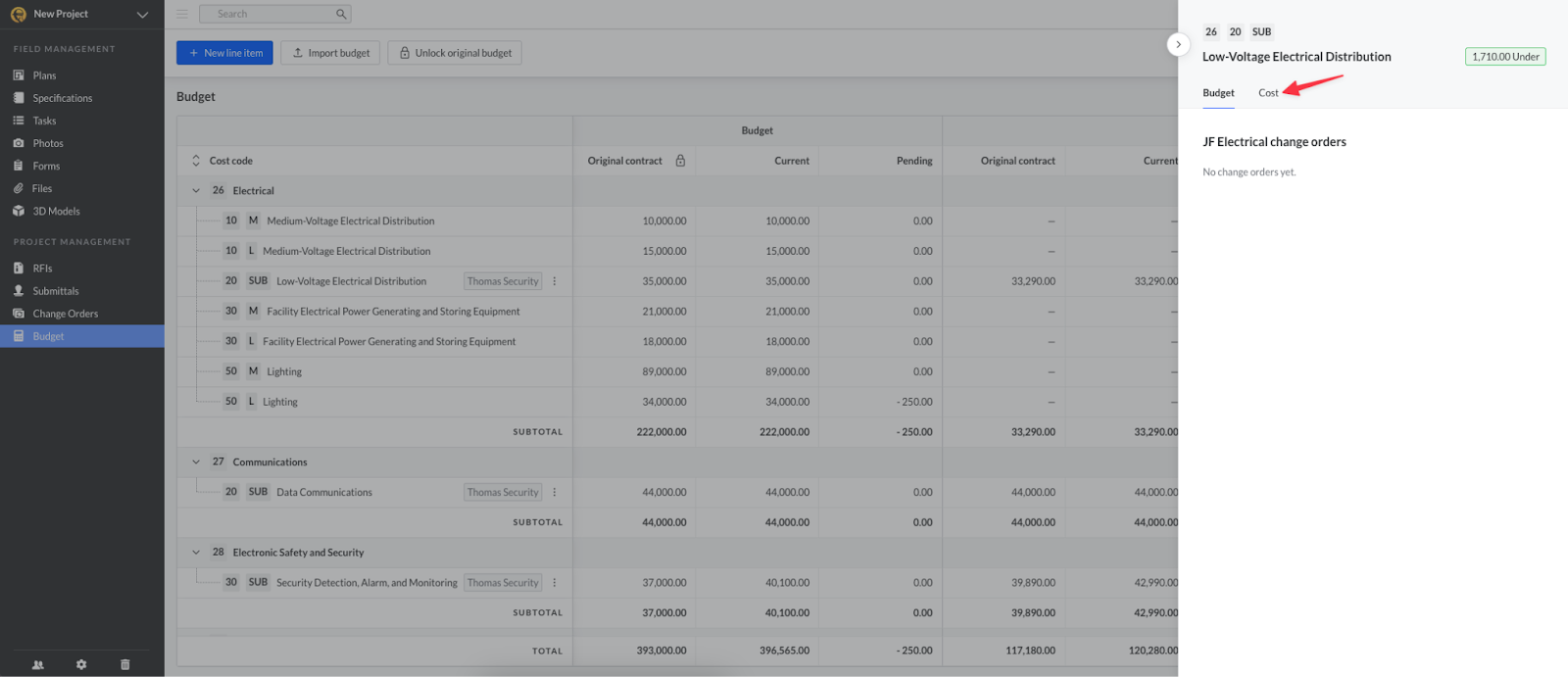 Una volta approvato l’ordine di modifica, il suo valore verrà aggiornato nella colonna “Attuale” della sezione Costo del modulo Budget.
