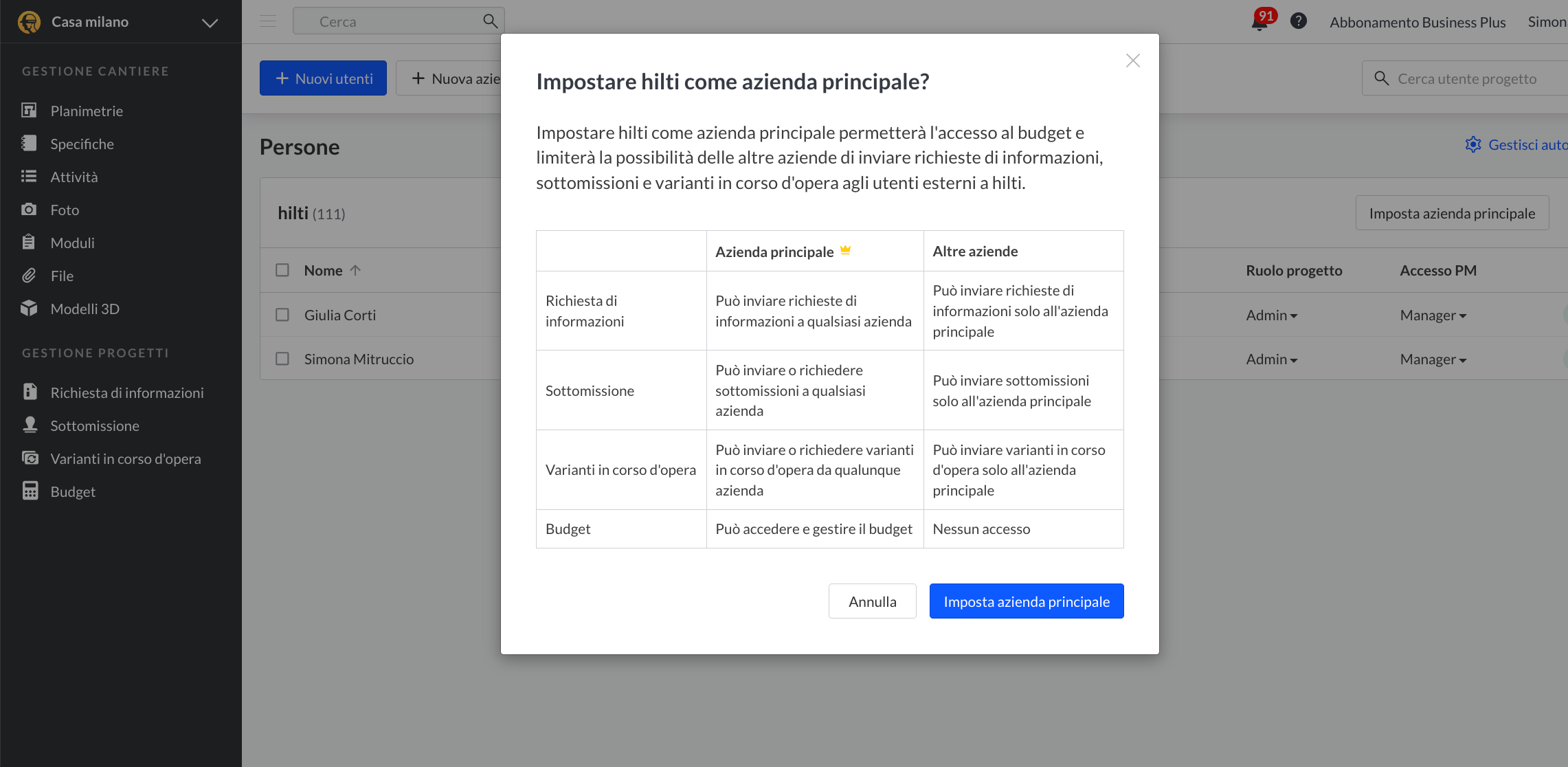 Dopo aver cliccato su “Imposta azienda principale”, appare un pop-up che mostra cosa possono fare gli utenti appartenenti all’azienda principale rispetto agli utenti delle altre aziende non designate come principali.