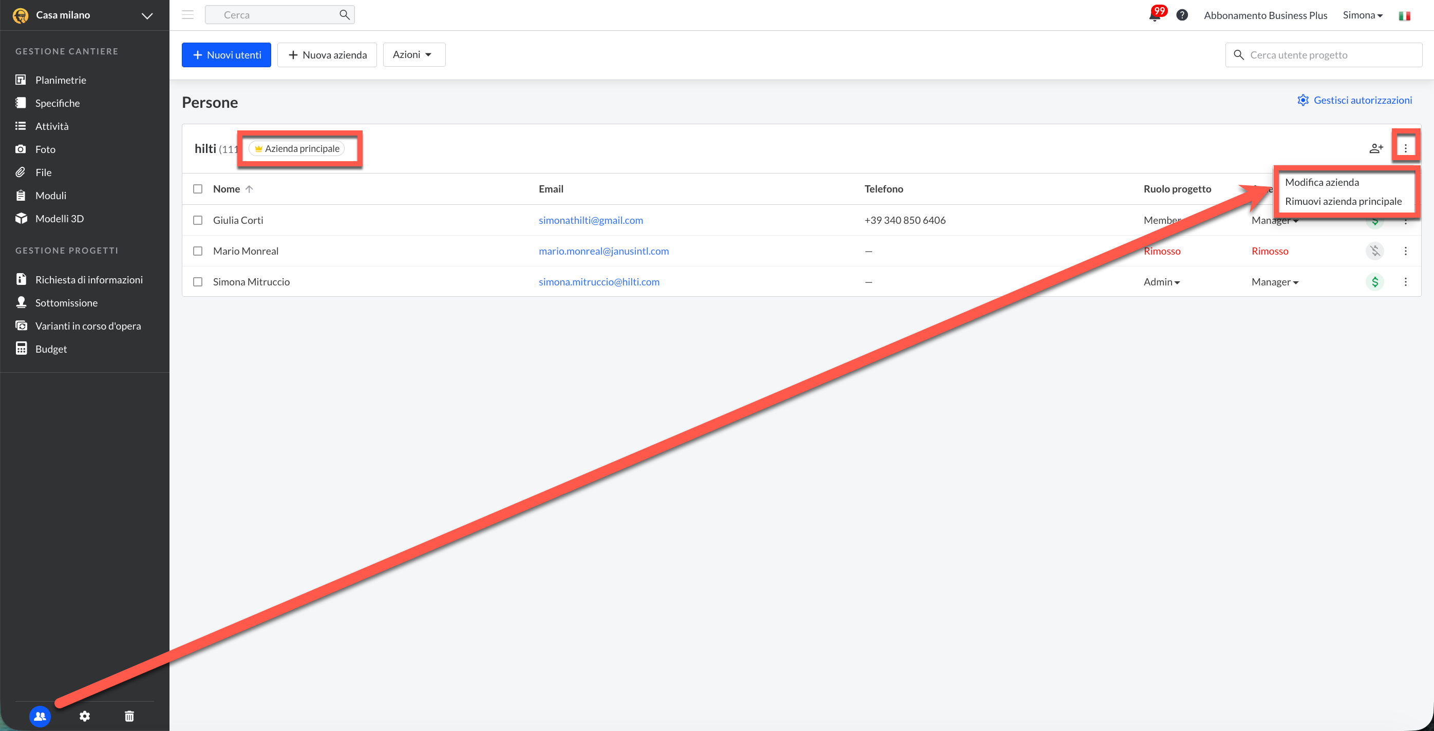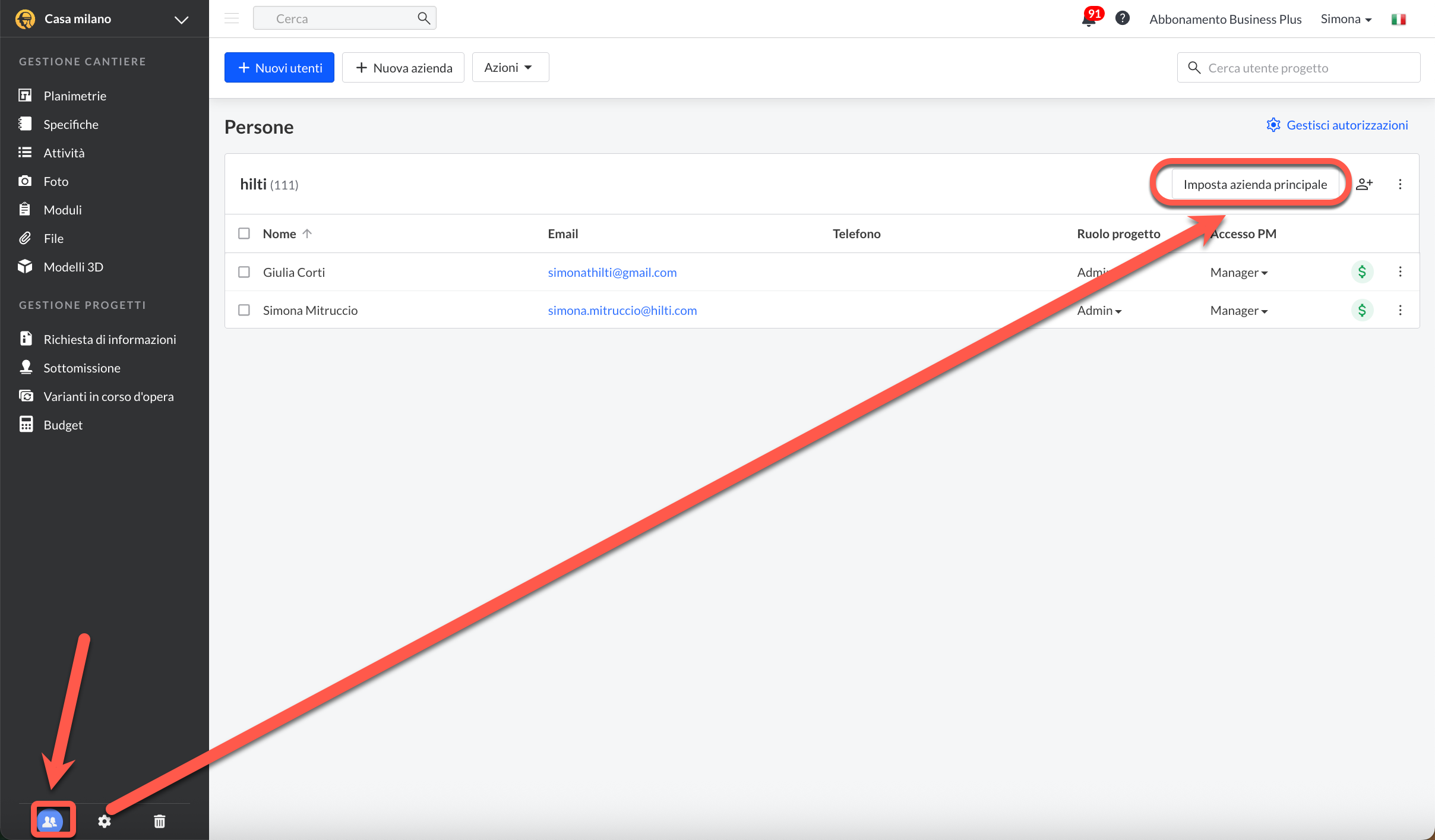 Per iniziare, vai alla scheda Persone del progetto e clicca su “Imposta azienda principale” accanto all’azienda che desideri designare come "principale”.