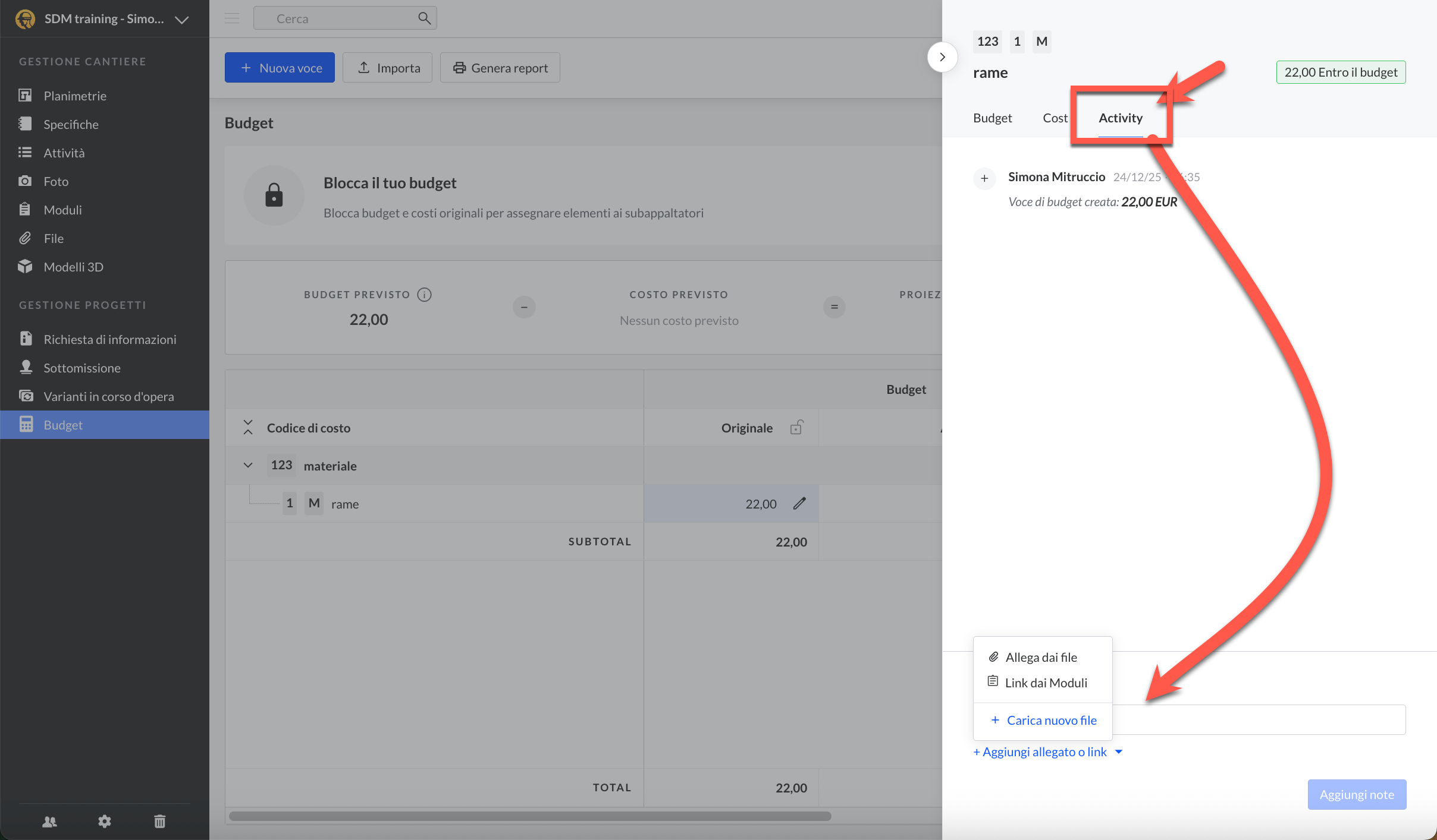 Nel feed delle attività delle singole voci di spesa, puoi anche collegare file e moduli esistenti! Questo è un modo semplice per gestire la documentazione direttamente dalla scheda Attività del Budget. Per aggiungere un file e/o un modulo: