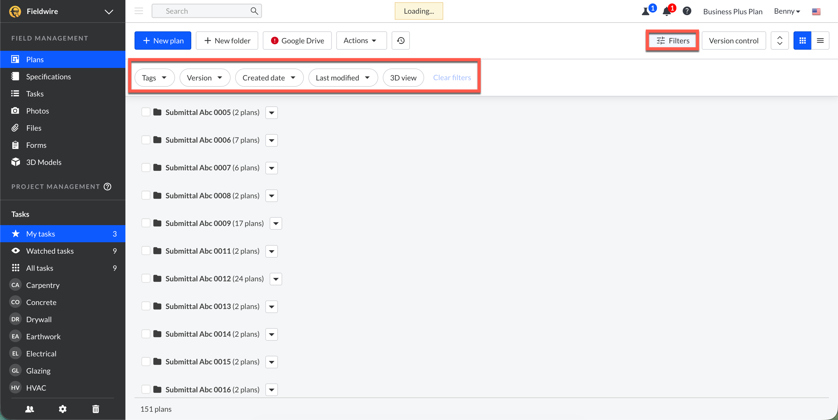 Nota: Per sfruttare appieno la barra di ricerca, devi inserire il nome del piano esattamente come appare in Fieldwire, inclusi punti, ".", e trattini, "-".