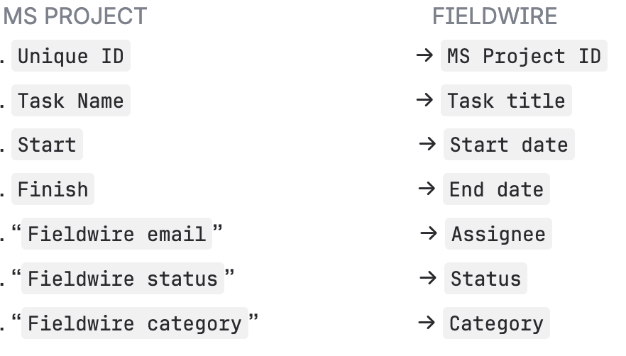 Le attività di Fieldwire ora appariranno in Microsoft Project con: