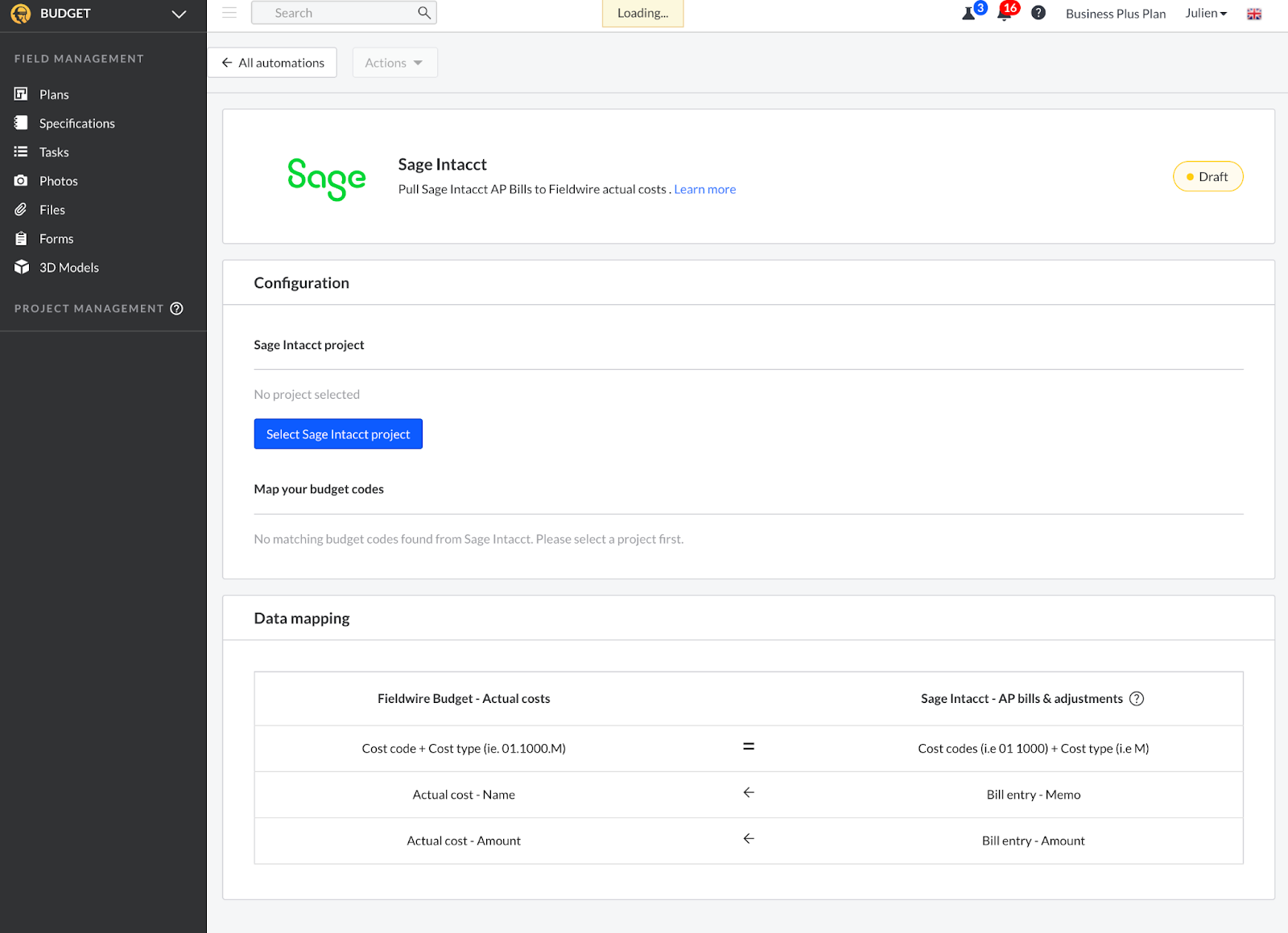 - Crea un'automazione che mappi le voci di budget di Fieldwire ai codici di costo e tipi di costo di Sage Intacct.