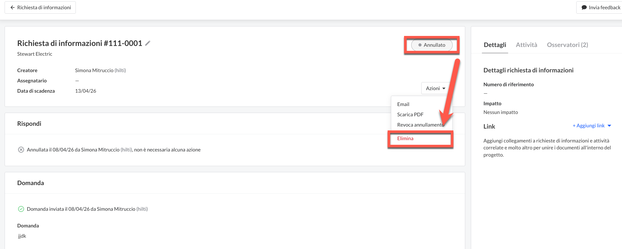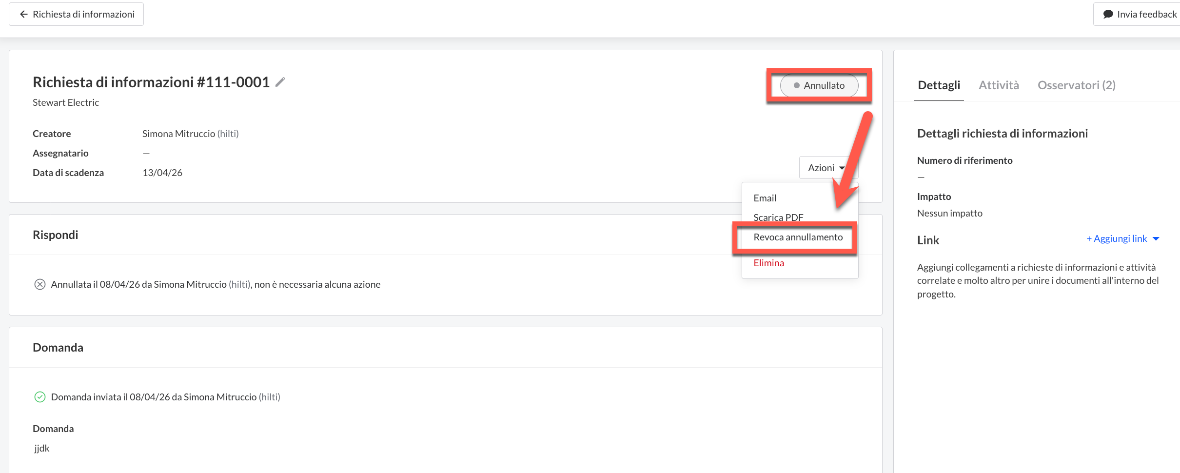 Se hai commesso un errore o per qualche motivo una Richiesta di informazioni non dovrebbe più essere annullata e serve ancora per il progetto, hai la possibilità di ripristinarla dallo stato di annullamento.