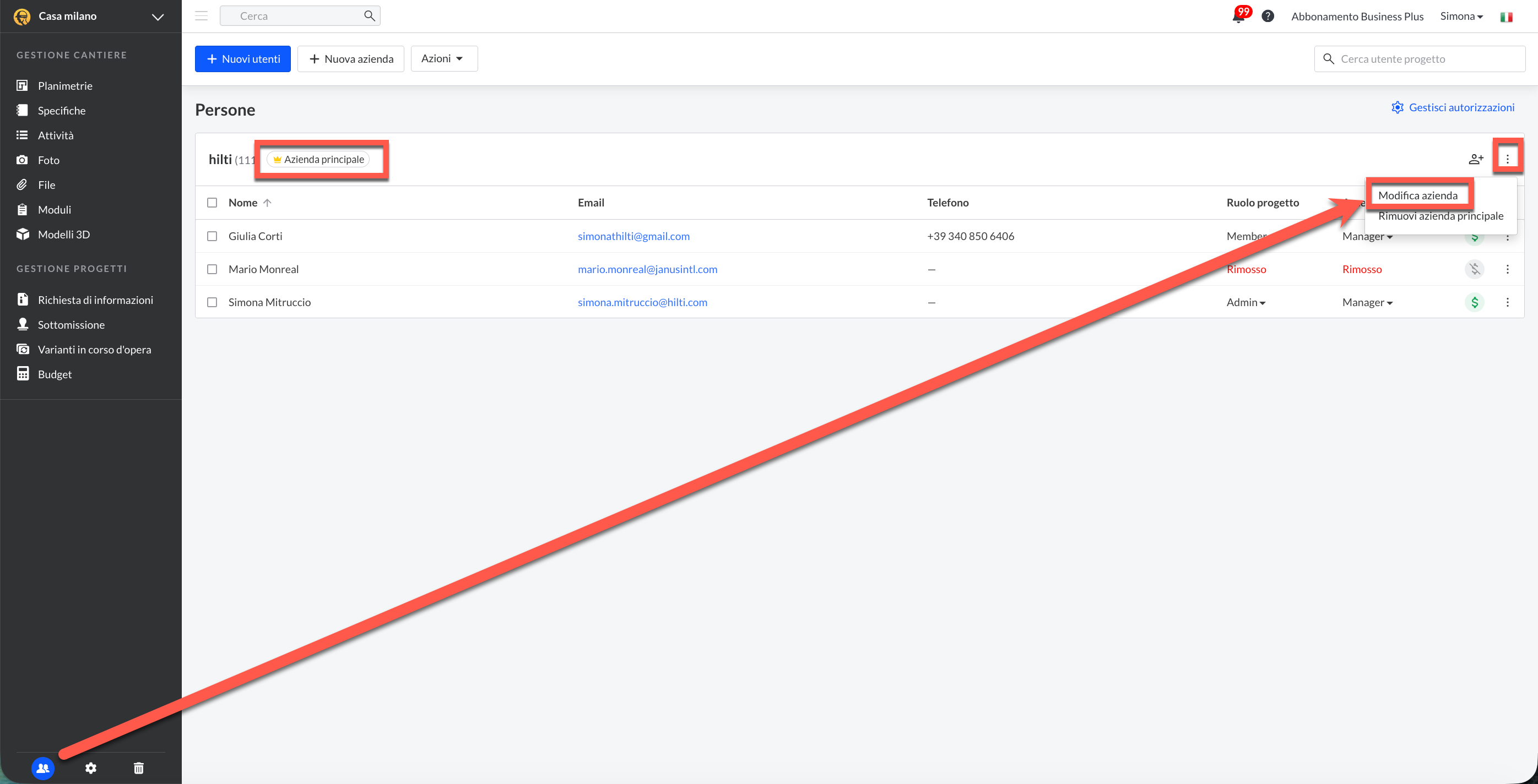 Se hai selezionato per errore l'azienda principale sbagliata, qualsiasi amministratore del progetto può modificarla procedendo come segue: