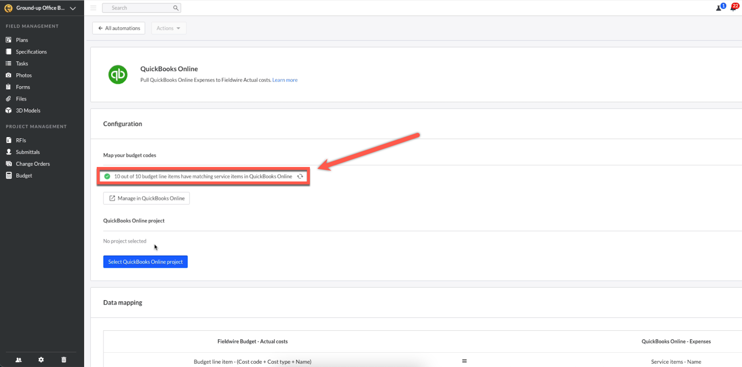 Automatiseringen bepalen hoe gegevens tussen QuickBooks Online en Fieldwire stromen.